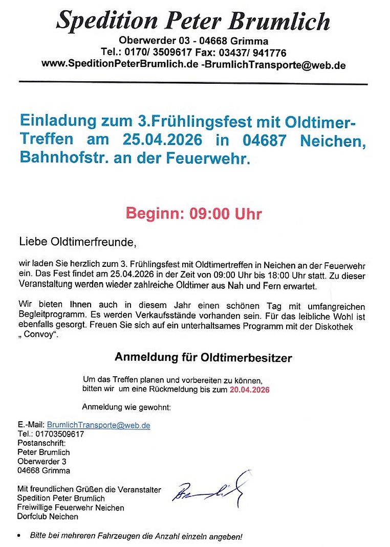 4. Frühlingsfest & Oldtimertreffen 04687 Trebsen OT Neichen , Kleine Bahnhofstr. (Feuerwehr) |